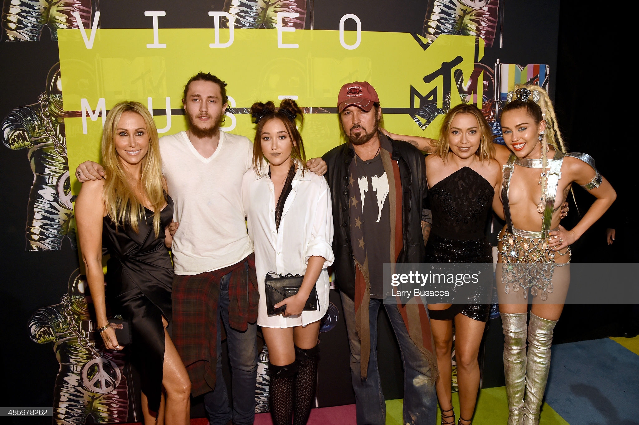 LOS ANGELES, CA – AUGUST 30: (L-R) Producer Tish Cyrus, actors Braison Cyrus, Noah Cyrus, recording artist Billy Ray Cyrus, actress Brandi Glenn Cyrus, and host Miley Cyrus attend the 2015 MTV Video Music Awards at Microsoft Theater on August 30, 2015 in Los Angeles, California. (Photo by Larry Busacca/Getty Images)