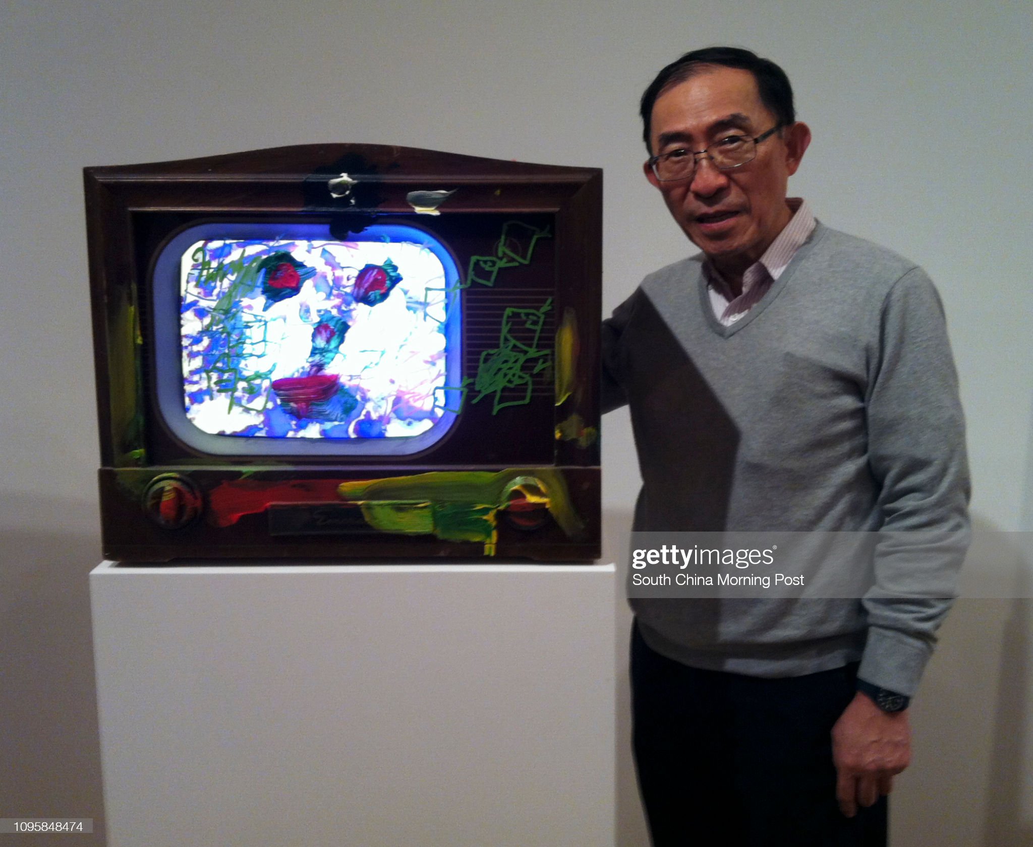 Paik’s nephew and executor Ken Hakuta with an untitled work from 2005. 17SEP15 [04 OCTOBER 2015 THE REVIEW ARTS side] (Photo by Enid Tsui/South China Morning Post via Getty Images)