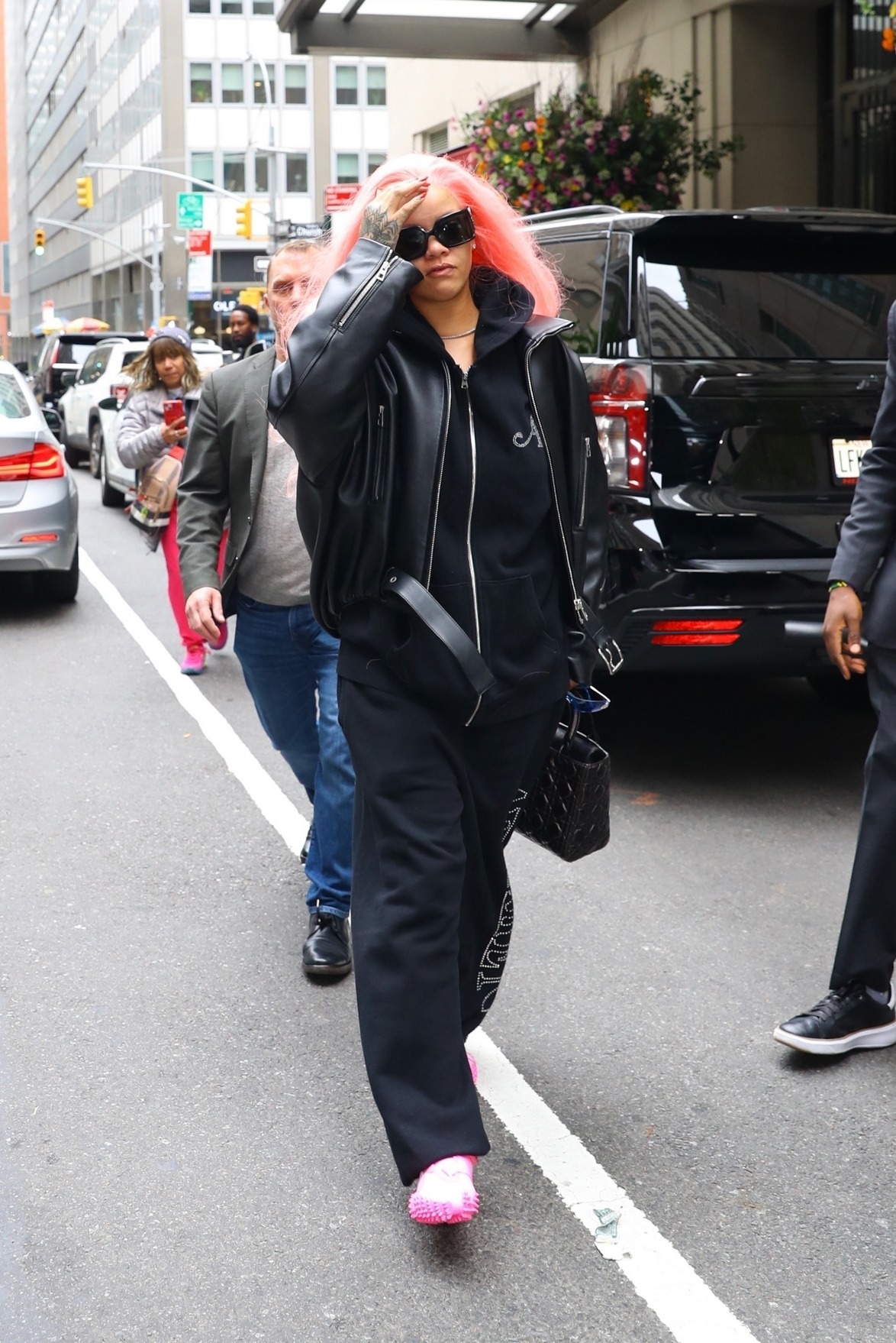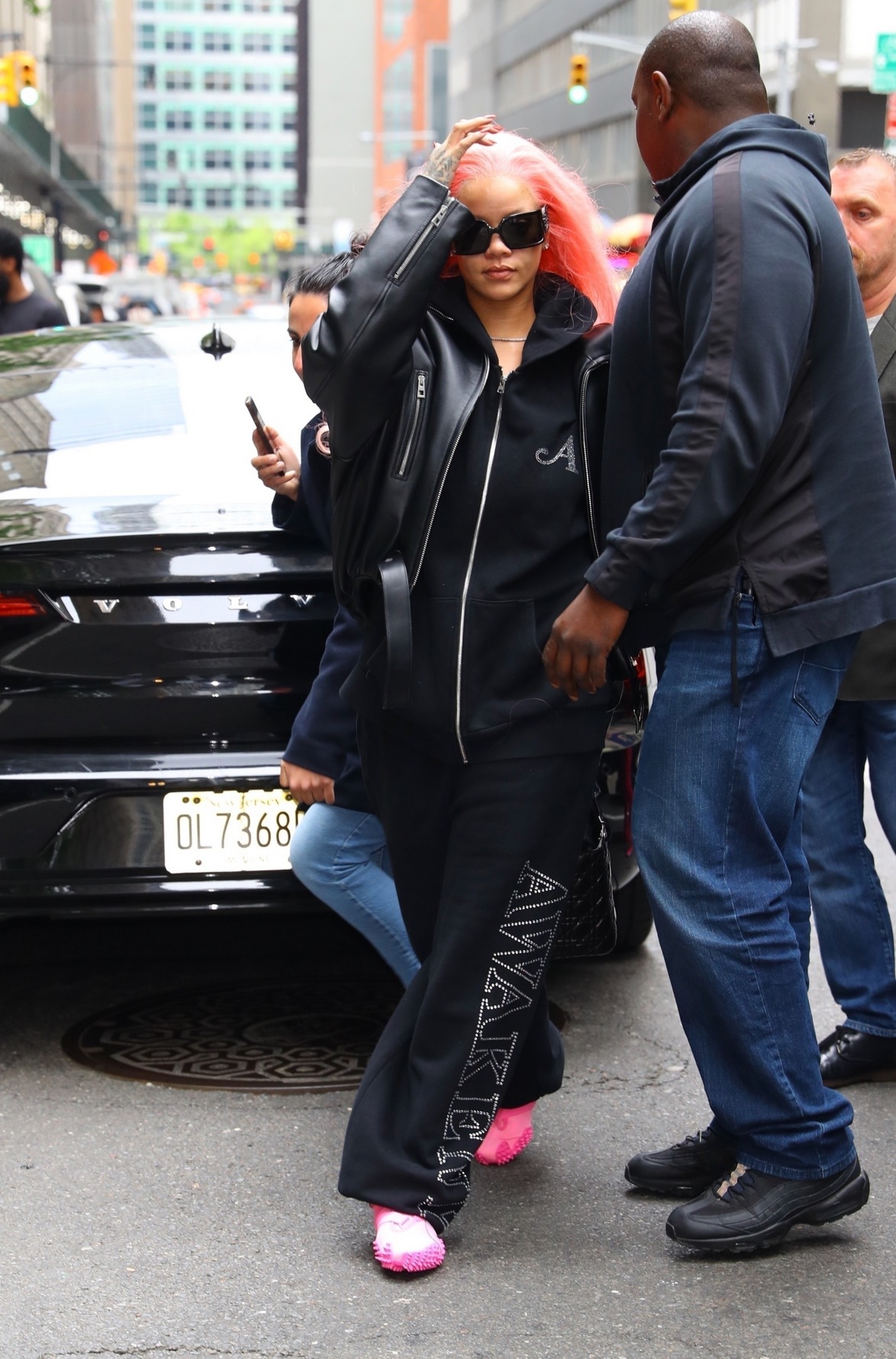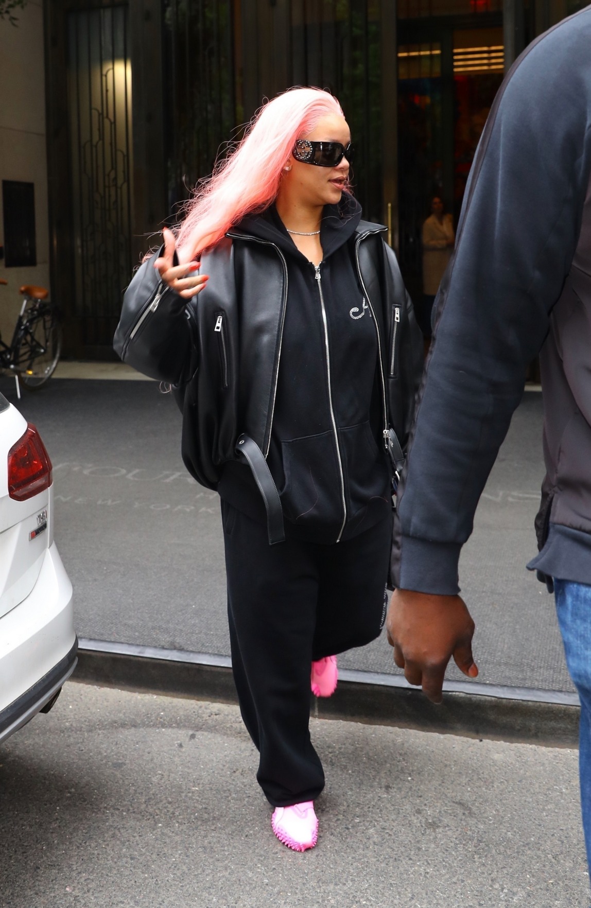 Rihanna was spotted with pink hair in New York City ahead of the Met Gala.